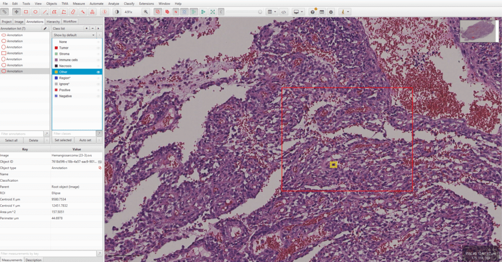 Example of AI development from (digital whole slide image; WSI) histopathology image. Regions of interest (red square) highlight mitotic activity (yellow circle) in a confirmed canine haemangiosarcoma.